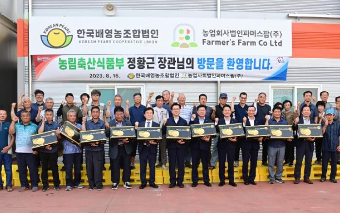 진주시는 16일 농산물 수출단지 중 하나인 문산읍 소재 한국배영농조합법인에서정황근 농림축산식품부 장관과 조규일 진주시장이 참석한 가운데 햇배를 캐나다로 수출하는 선적식을 가졌다.▲ (사진=진주시 제공)한국배영농조합에서 개최된 이날 선적식에서 13.6t(6000만 원 상