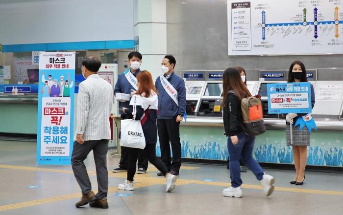인천교통공사는 25일 인천지하철 1·2호선 4개역(인천터미널역, 부평시장역, 주안역, 모래내시장역)에서 지하철을 이용하여 출근하는 고객들을 대상으로 코로나19 감염병 예방을 위한 마스크 착용 홍보 캠페인을 진행하였다.이날 캠페인은 코로나19 대응체계가 ‘생활 속 거리두