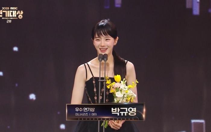 배우 박규영이 '2023 MBC 연기대상' 미니시리즈 부문 여자 우수연기상의 영예를 안았다. 소속사 사람엔터테인먼트 측은 "배우 박규영이 '2023 MBC 연기대상'에서 미니시리즈 부문 여자 우수연기상을 수상했다"고 전했다. 지난 30일 '2