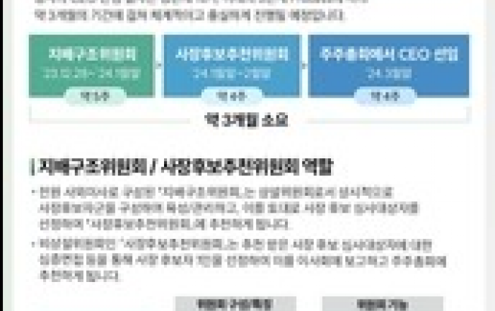 KT&G는 28일 이사회 및 이사회 내 위원회인 지배구조위원회를 열어 사장 후보 심사기준 등을 의결하며 차기 사장 선임을 위한 본격적인 절차에 착수했다. 지배구조위원회는 전원 사외이사로 구성돼 있으며, 이번 이사회는 독립적 의사결정을 위해 사외이사만 참석했다.