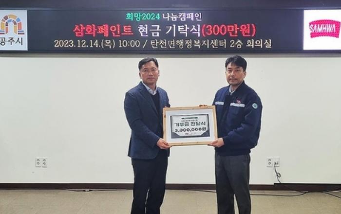 삼화페인트공업㈜은 공주 생산본부가 위치한 충청남도 공주시 탄천면에 성금 300만 원을 기탁했다. 기탁된 성금은 충남 사회복지공동모금회를 통해 취약계층에게 전달된다. 삼화페인트는 지역사회 나눔에 동참하고 지역상생발전을 위해 2015년부터 공주시 희망나눔캠페인에 참여하