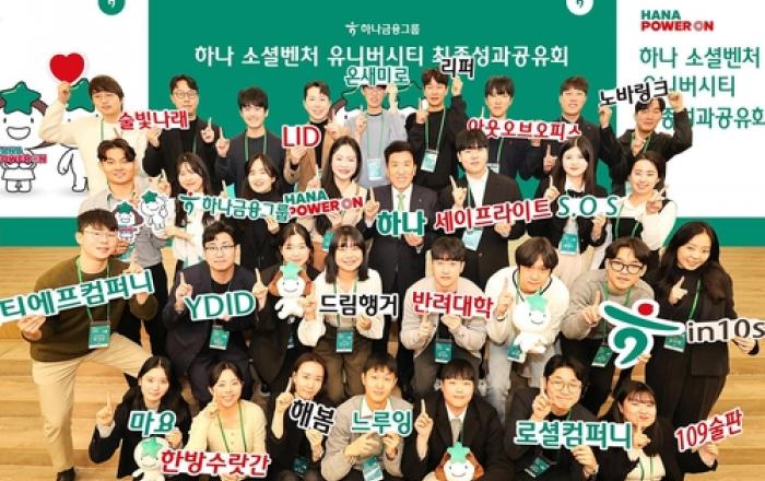 하나금융그룹은 지난 18일 명동사옥에서 청년 창업 상태계 구축 및 일자리 창출을 위한 그룹의 대표 ESG 경영 프로그램인 '하나 소셜벤처 유니버시티' 최종 성과공유회를 개최했다고 밝혔다 '하나 소셜벤처 유니버시티'는 각 지역의 거점대학과 함께 청년 창업가를 육성할
