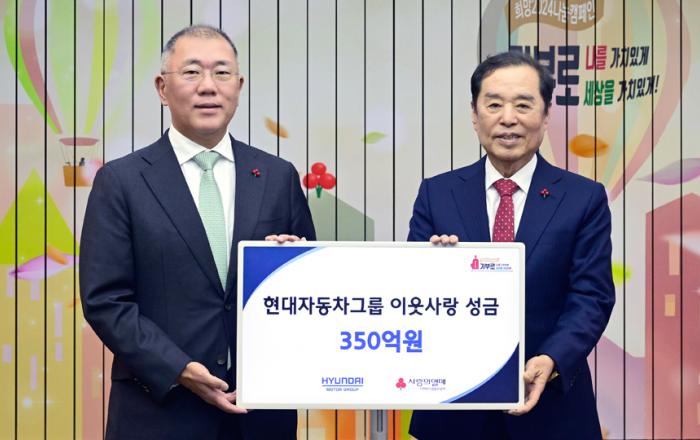 현대자동차그룹이 이웃사랑 성금 350억 원을 사회복지공동모금회에 전달했다. 현대자동차그룹은 18일(월) 서울시 중구에 위치한 사회복지공동모금회 사랑의열매 회관에서 현대자동차그룹 정의선 회장, 김걸 사장, 사회복지공동모금회 김병준 회장, 황