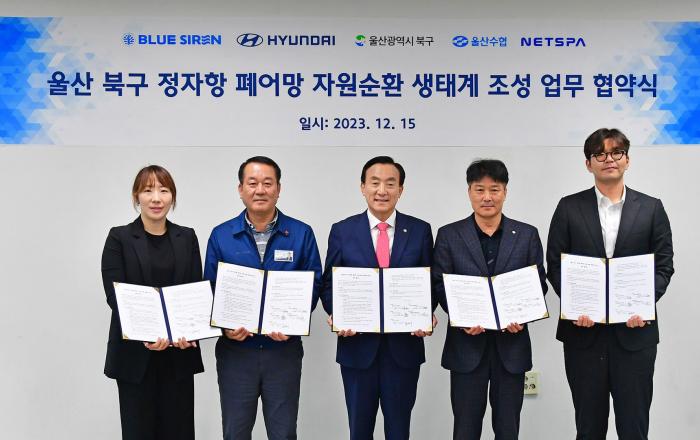 현대자동차가 폐어망 업사이클링을 통한 자원순환 생태계 조성에 적극 나선다. 현대자동차는 15일(금) 울산 정자항에서 울산 북구청, 울산 수산업협동조합(이하 울산 수협), 폐어망 업사이클 소셜벤처기업 넷스파, 비영리 해양복원단체 블루사이렌과
