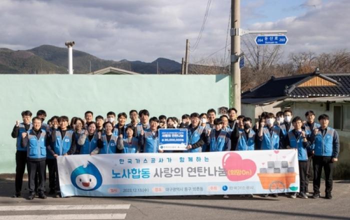 한국가스공사는 지난 13일 대구광역시 동구 방촌동 일대에서 노사합동 사랑의 연탄 나눔 봉사활동을 펼쳤다고 밝혔다. 이날 봉사활동은 대구지역 취약계층의 에너지 복지를 실현하고 상생의 노사문화를 구축하기 위해 시행됐으며, 김천수 경영지원본부장과 김경인 노동조합 부지