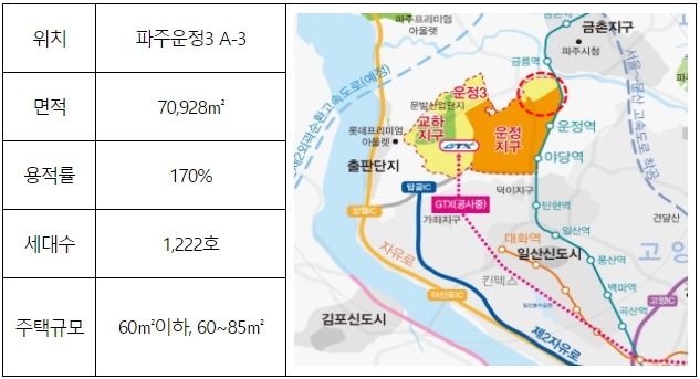 서울-문산고속도로 및 77번 국도(자유로)를 통해 인접 시, 군, 구로의 접근이 용이하고, 사업지구 남측 약 2km 지점에 운정역(경의중앙선)이 위치하고 있다.