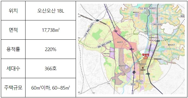 총 17,738㎡ 부지에 전용면적 60㎡이하 및 60~85㎡의 공동주택 366세대를 공급할 계획이다.