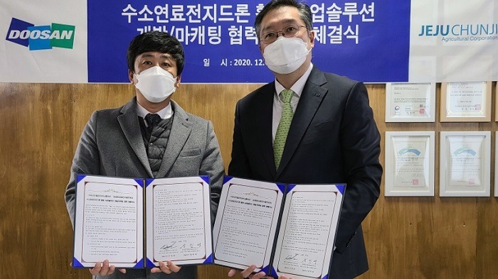 두산모빌리티이노베이션(이하 DMI)은 농업회사법인제주천지(이하 제주천지)와 ‘수소연료전지드론을 활용한 농업 솔루션 개발’을 위한 업무협약(MOU)을 체결했다고 22일 밝혔다. 제주천지는 드론과 무인헬기를 활용해 농림업 분야에서 영상분석과 재배 정보를 제공하는 기술전문회사로, 다양한 정부 국책과제를 수행하고 있다.