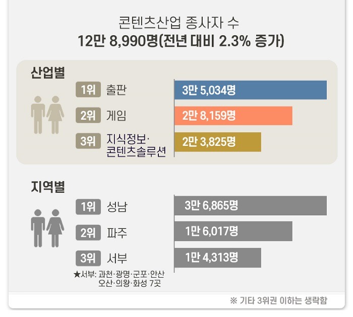 일자리를 가늠할 수 있는 종사자 수는 총 12만 8,990명으로 전년도인 2017년 12만 6,126명 대비 2.3% 증가했고, 산업별로는 출판(3만 5,034명), 게임(2만 8,159명), 지식정보/콘텐츠솔루션(2만 3,825명) 순으로 나타났다. 지역별로는 성남(3만 6,865명), 파주(1만 6,017명), 서부(1만 4,313명) 순이다.