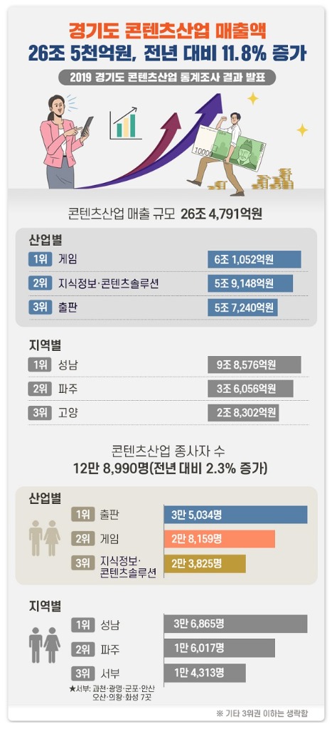 경기도와 경기콘텐츠진흥원은 22일 도내 콘텐츠산업의 매출액, 종사자수, 수출액 등을 조사한 국가승인통계 ‘2019 경기도 콘텐츠산업 통계조사’ 결과(’18년 기준)를 발표했다.