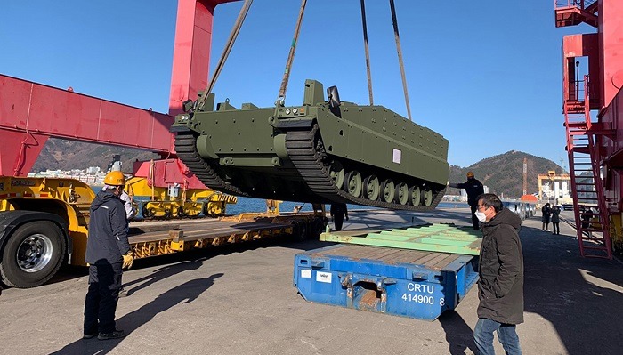 한화디펜스가 개발한 미래형 궤도장갑차 레드백(Redback) 시제품 3호기가 지난 18일 경남 마산항에서 선적돼 호주로 떠났다.