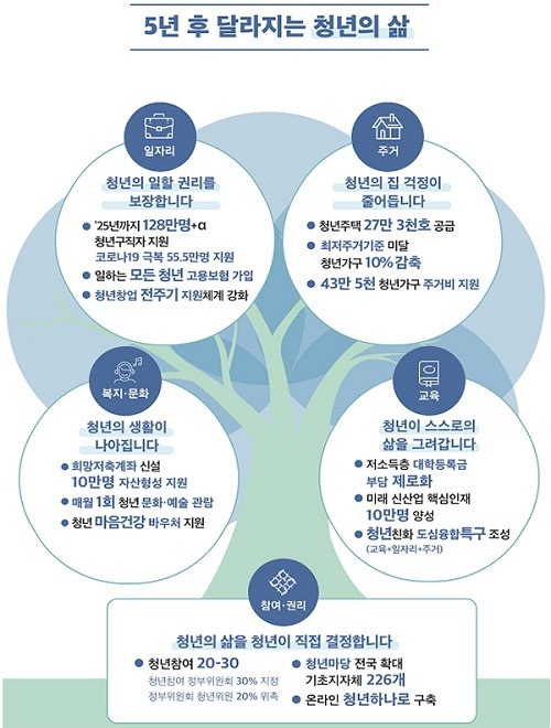 우선 일자리 분야에서 코로나19 조기 극복을 위해 내년 55만 5000명의 청년 구직자를 지원하며 2025년까지 총 128만명 이상의 청년 구직활동을 돕는다.