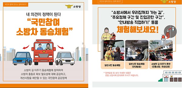 먼저 소방청에서 추진하고 있는 ‘소방차 동승체험’은 국민이 직접 방화복을 입고 소방서 직원과 함께 소방차에 탑승해 양보운전 및 불법주정차 근절에 대한 공감대를 형성하는 체험형 정책이다.