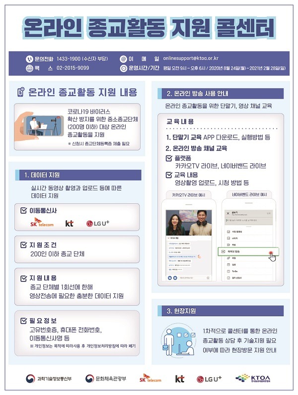 비대면 온라인 종교활동을 시작하고자 하는 종교단체는 한국통신사업자연합회 누리집(www.ktoa.or.kr)을 통해 ‘온라인 종교활동 이용안내서(매뉴얼)’를 내려 받아 국번 없이 ☎1433-1900로 전화해 데이터 지원을 신청하거나 스마트폰을 이용한 영상 촬영 및 송출 등에 대한 기술적 지원을 받을 수 있다.