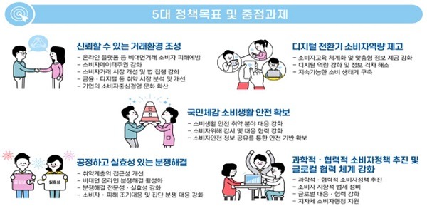 ‘디지털시대 새로운 소비자가 이끄는 공정한 시장경제’라는 비전 아래 코로나19 이후의 소비환경 변화 분석 및 정책수요 전망을 토대로 5대 정책 분야에서 16개 중점 과제 및 36개 세부 과제를 마련했다.