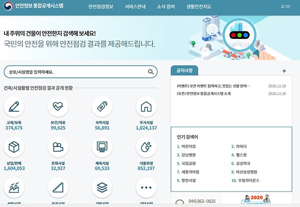 이에 행안부는 안전정보 통합공개시스템 구축사업을 추진, 인터넷 지도를 이용해 건축물, 시설물 관련 안전정보를 손쉽게 확인하고 이용할 수 있도록 했다.