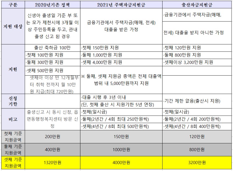 이전의 출산 지원 정책은 출산축하금 100만원(일시급), 첫째 100만원▲둘째 300만원▲셋째 500만원 지원해주고, 추가로 셋째아이(만 12개월부터 취학 전까지)는 아동양육비 지원으로 최대 60 개월동안 월 10만원씩 지원 받아 최대 720을 지원받을수 있다.