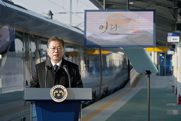문 대통령은 “저탄소·친환경 열차 ‘KTX-이음’은 코로나의 어두운 터널을 지나 행복을 실어 나를 희망의 열차”라며 “올해 우리는 코로나를 이기고 다시 북적이는 기차역에서 사랑하는 사람들과 만나게 될 것이다. 정부는 국민이 지켜낸 희망을 새로운 일상으로 반드시 보답하겠다”고 덧붙였다.