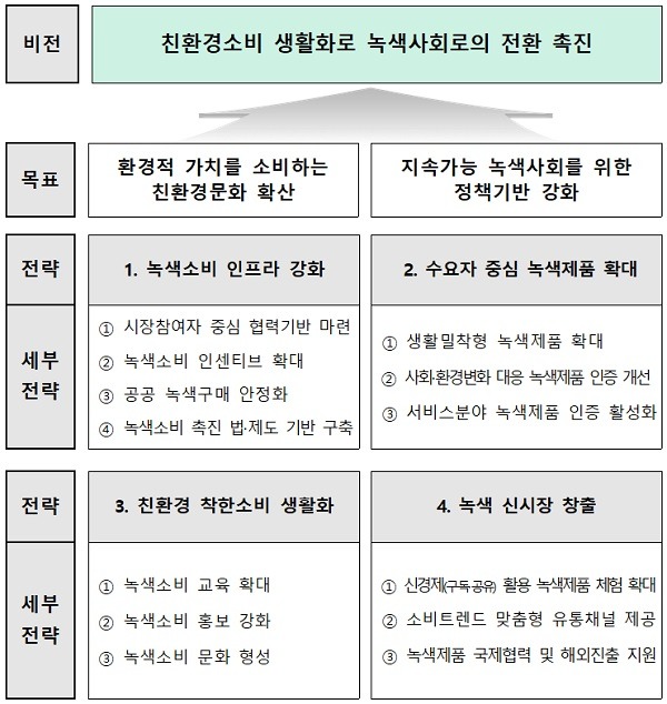 또한 ‘환경적 가치를 소비하는 친환경문화 확산’과 ‘지속가능한 녹색사회를 위한 정책기반 강화’를 목표로 한다.