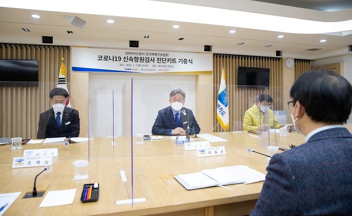 이재명 경기도지사는 7일 경기도청 상황실에서 이효근 SD바이오센서 대표이사, 송필호 희망브리지 전국재해구호협회 회장이 참석한 가운데 코로나19 신속항원검사 진단키트 기증식을 진행했다.
