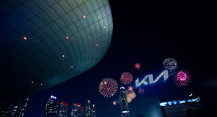 기아자동차 디지털 채널을 통해 진행된 언베일링 행사는 총 303대의 드론이 하늘에서 불꽃을 내뿜으며 새로운 로고를 그리는 형식으로 진행됐다.