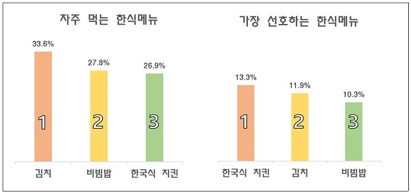 해외에서 가장 자주 먹는 한식은 ‘김치’이고 가장 좋아하는 음식은 ‘한국식 치킨’인 것으로 나타났다.