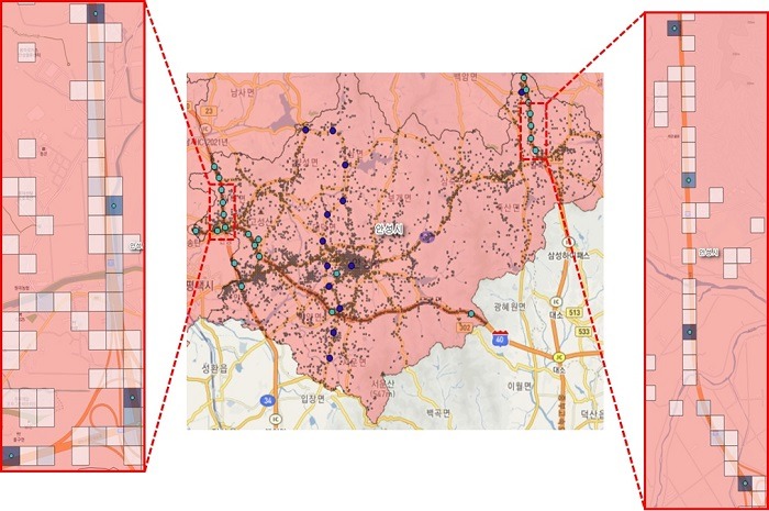분석 과정을 살펴보면 먼저 경기도 전역을 100m×100m 크기의 격자 약 100만개로 나누고, 각 격자에 해당하는 돌발상황 데이터를 입력했다. 그 다음 시군단위로 격자별 5단계 위험등급을 산정해 분류했으며, 현재 경기도에 설치돼 운영중인 교통CCTV 관리지역을 추가로 입력했다. 이를 통해 경기도 전역에서 교통안전관련 집중관리지역 172곳을 선정했으며, 추가로 관리권고 지역 879곳을 선정했다.