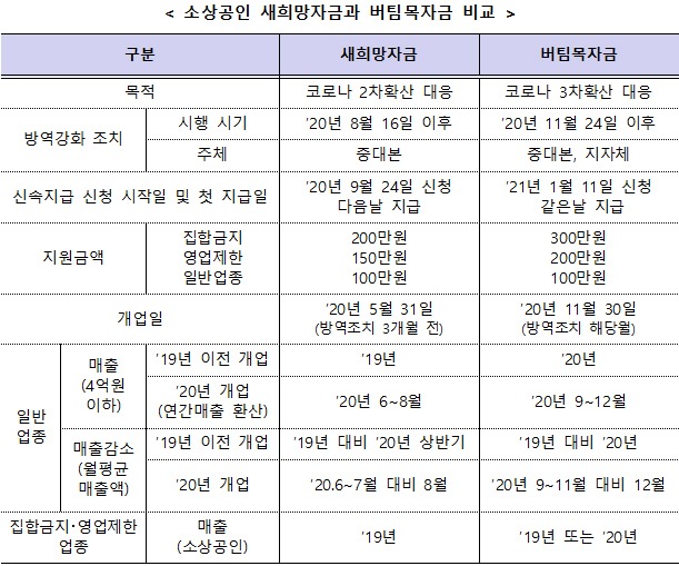 한편, 소상공인 버팀목자금은 새희망자금과 달리 코로나19에 따른 집합금지·영업제한 업종을 우선 지원한다. 공통적으로 지급되는 100만원 외에 집합금지·영업제한 업종에는 임차료 등 고정비용 경감을 위해 각각 200만원, 100만원을 추가 지급한다.