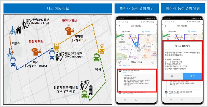 “My-T(마이티)” 앱 에서 수집 되는 개인 위치정보(GPS)와 대중교통 운행정보, 교통카드 승하차정보, 교통수단별 Wi-Fi 정보 등이 결합· 분석되어 개인 통행·이동 궤적과 확진자 이동 동선을 비교하여 확진자 접촉 여부를 알려준다.