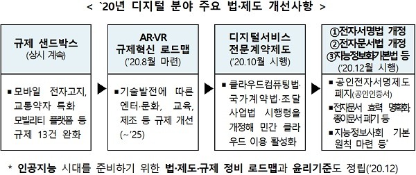 공인전자서명제도(공인인증서) 폐지(2020년 12월), 디지털서비스 계약제도 도입(2020년 10월) 등 다양한 분야의 법·제도를 개선하고 인공지능 윤리기준 마련 등 미래 준비를 위한 노력을 기울여왔다.