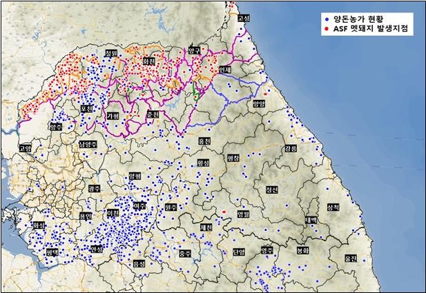 특히 대다수 양돈농장이 야산 인근에 있어 바이러스 유입이 용이하고 농장 중에는 소독·방역시설이 미흡한 곳이 있으며 축산차량의 농장 출입 및 시도 간 이동 등을 감안할 때 아직 방역여건은 취약한 실정이다.