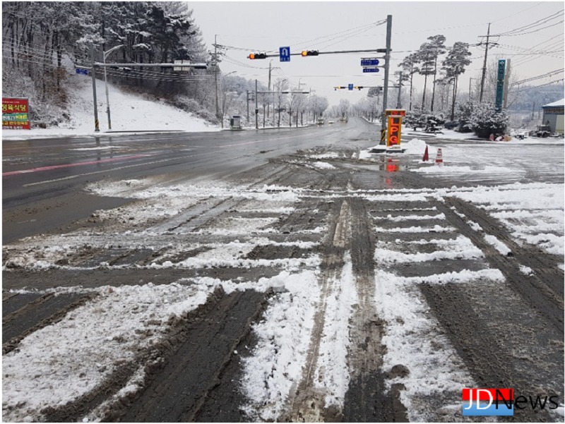 이 도로는 제천시에서 눈제설 차량이 2번 이상 작업을해 출근 시간에 깨끗이 정비되어 있는 상태였다.