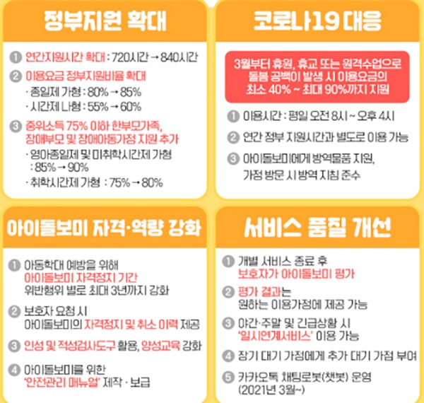 아이돌봄서비스 정부지원시간이 연 720시간에서 연 840시간으로 늘어나고 저소득 한부모가족과 장애부모·장애아동가정의 경우 최대 90%까지 지원하는 등 정부지원비율이 확대된다.