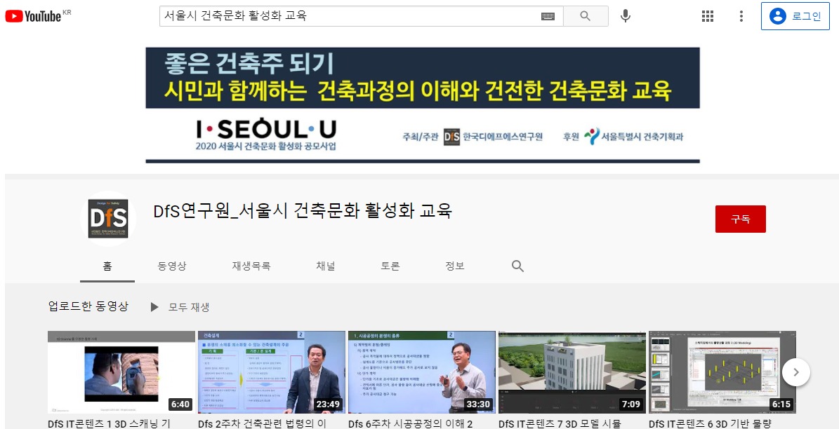 아울러 서울시는 건축문화 활성화 공모사업으로 ‘시민과 함께하는 건축 문화교육’을 제안한 한국디에프에스연구원의 「좋은 건축주 되기」교육을 후원하고, 강의 영상을 유튜브(https://www.youtube.com)에 게재하였다.
