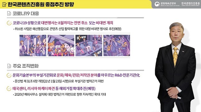 올해 콘진원은 ‘콘텐츠산업 3대 혁신전략’과 ‘디지털뉴딜 성장전략’을 정책방향으로 삼고 콘텐츠산업을 우리나라 주력 산업으로 육성하고자 한다. 이를 위해 ▲실감콘텐츠 육성, ▲콘텐츠 기업 자금조달을 위한 정책금융 확대, ▲신한류와 연관산업을 결합한 비대면 해외진출 강화, ▲공공기관의 역할에 충실한 사회적 가치 창출에 더욱 집중할 계획이다.