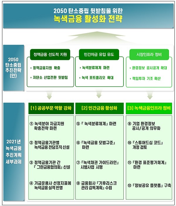 올해 ‘녹색금융 추진계획’은 ‘2050 탄소중립 추진전략’ 중 녹색금융 활성화 부분을 내실화해 3대전략 12개 실천과제를 도출했다.