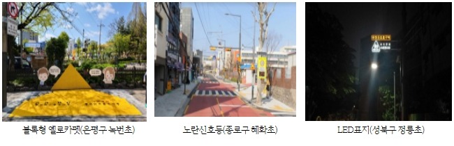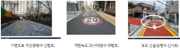 지난 해 중랑구 신현초, 강서구 가양초, 서대문구 대현초, 은평구 신사초, 구로구 신도림초, 동구로초 등 33개소에 우선적으로 시행됐으며, 차량 감속을 유도하기 위해 도로 전체를 디자인 블록으로 포장하거나 구간마다 방지턱을 적극 설치했다.
