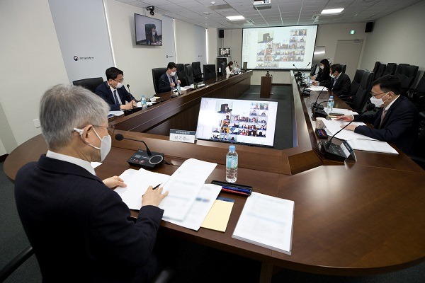 최기영 과학기술정보통신부 장관이 26일 오후 세종특별자치시 세종파이낸스센터 과기정통부 영상회의실에서 열린 ‘제4차 5G+ 전략위원회’ 에 참석해 인사말을 하고 있다.