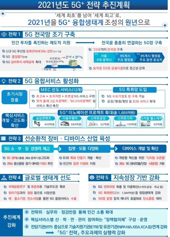 우리나라는 세계 최초 5G 상용화 이후, 가입자가 1000만 명을 돌파(2020년 11월)하는 한편 5G 단말·장비 시장에서 점유율을 확대했으며 실감콘텐츠를 중심으로 융합서비스 수출도 증가하는 등 글로벌 시장을 선도해 왔다. 지난해 3분기엔 5G 단말시장 점유율 2위를 차지했고 북미·아시아 등 주요국에 5G장비 수출 등도 활발했다.