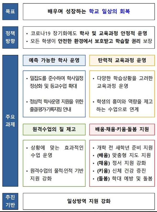이번 지원 방안은 안정적이고 탄력적인 학사 및 교육과정 운영, 원격수업 내실화, 학습격차·돌봄에 대한 개선 요구가 지속되고 있는 상황을 고려해 학교 일상의 회복을 지원하기 위해 마련됐다.