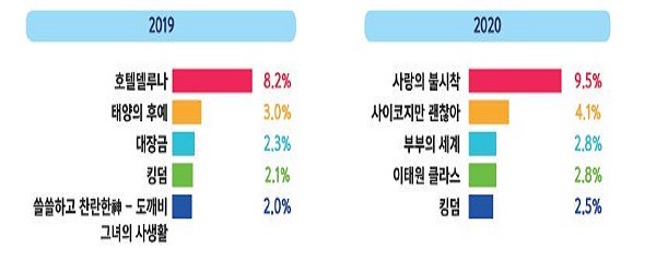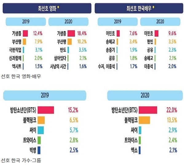 특히 드라마 부문에선 ‘사랑의 불시착’, 영화 부문에선 ‘기생충’, 한국가수 그룹 중 방탄소년단(BTS)이 가장 선호하는 것으로 확인됐다.