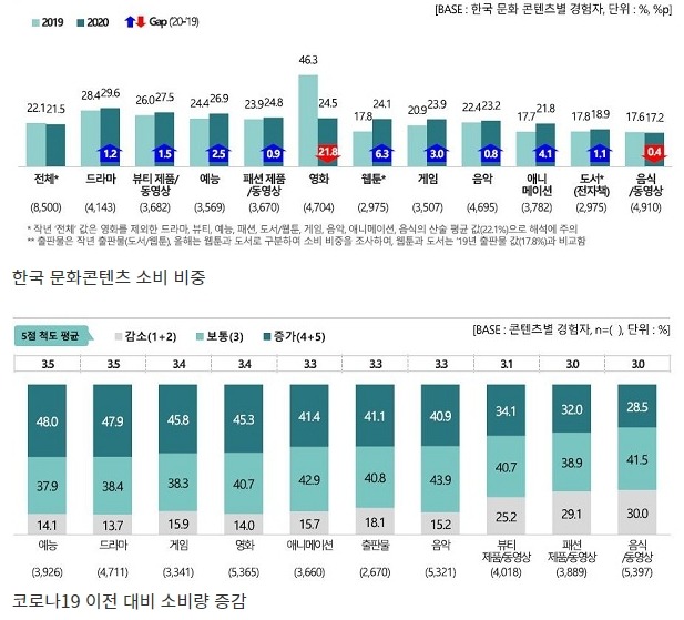 코로나19 위기 속에도 드라마·예능·게임 등 한류 콘텐츠의 소비 비중은 증가했으며 해외 한류 소비자들은 주로 온라인·모바일을 통해 한류 콘텐츠를 접촉하는 것으로 나타났다.