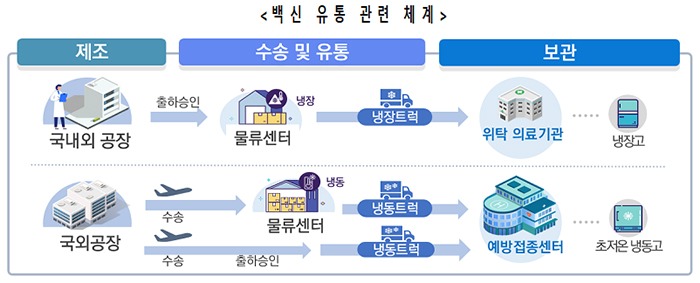 코로나19 백신은 제조사별 보관과 유통 조건이 다르고 백신별 예방접종 장소도 다양하므로, 백신 국내 도착 후 예방접종까지 민·관·군 합동으로 안전한 백신의 유통과 보관 체계를 마련한다.