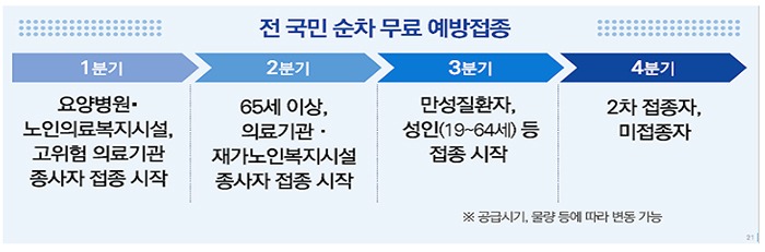 2분기에는 65세 이상 국민들과 노인재가복지시설, 장애인 거주·이용시설 등 취약시설 입소자와 종사자에게 예방접종을 시행한다.