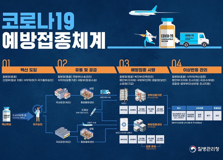 정부는 예방접종의 안전하고 신속한 시행을 위해 백신의 도입부터 허가, 유통, 예방접종 시행, 이상반응 관리까지의 전 과정을 범정부의 가용 자원을 총동원해 준비했으며 앞으로도 총력 대응한다.