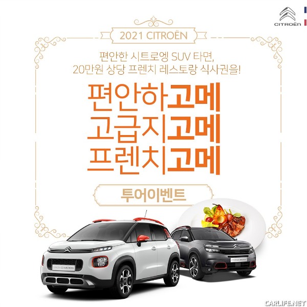시트로엥은 2월 한 달간 SUV 모델 구매 고객에게 프렌치 레스토랑 식사권과 행사 참여시 선물을 증정하는 ‘프렌치 고메 투어’ 시승 캠페인을 진행한다. 이번 프로모션은 자동차 뿐만 아니라 프랑스의 식문화를 함께 즐길 기회를 제공해 라이프스타일 브랜드로서의 이미지를 강화하고자 마련했다.