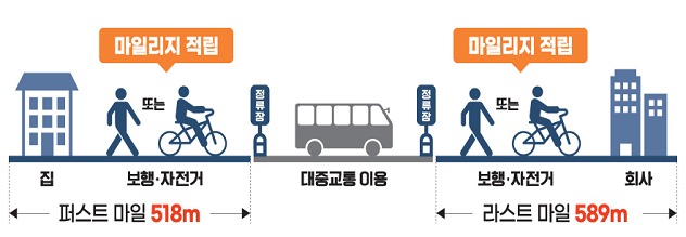 알뜰카드 이용자가 대중교통을 타기 위해 걷거나 자전거를 통해 이동한 거리는 평균 1107m로 집계됐다. 출발지에서 대중교통 승차지점까지는 518m, 대중교통 하차지점에서 도착지까지는 589m를 이동한 것으로 분석됐다.