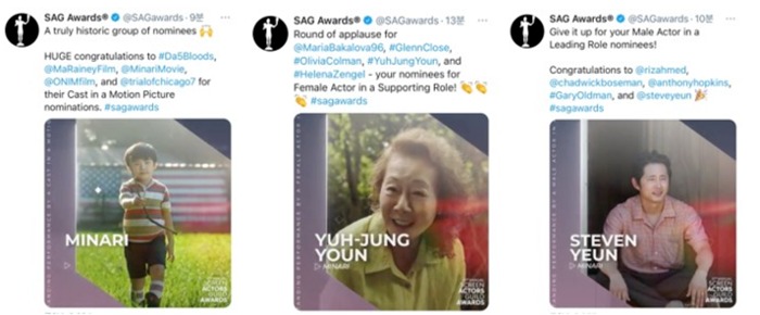 <미나리>가 영화 부문 앙상블상, 여우조연상, 남우주연상에 노미네이트된 미국배우조합상은 미국 배우 조합이 주최하며 영화와 TV에서 활약하고 있는 미국 내 모든 배우들이 동료 배우들을 대상으로 상을 주는 시상식이다. 특히 수상작 선정에서 아카데미상을 주관하는 미국영화예술과학아카데미(AMPAS)와 유사성이 높기 때문에, 골든 글로브 및 크리틱스 초이스 시상식보다 훨씬 더 높은 확률로 오스카 연기상 수상자와 일치하고 있어 ‘미리 보는 오스카’로 불린다.