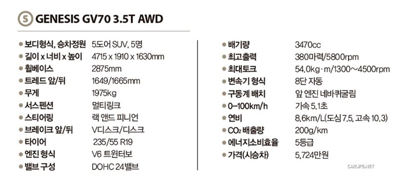 GV70은 조형, 공간, 성능, 기술 등 차를 구성하는 전 요소에서 시장을 압도할 높은 경쟁력을 뽐낸다. 제네시스의 더 나은 내일을 위한 발판이자 글로벌 무대 속 메이드 인 코리아의 저력을 증명할 또 하나의 카드다. ‘그래 봤자 국산차잖아?’라는 일부 부정적인 관점을 긍정적으로 돌리는 데도 무리가 없다. 시승차인 가솔린 3.5 AWD는 5,724만원부터 시작한다.