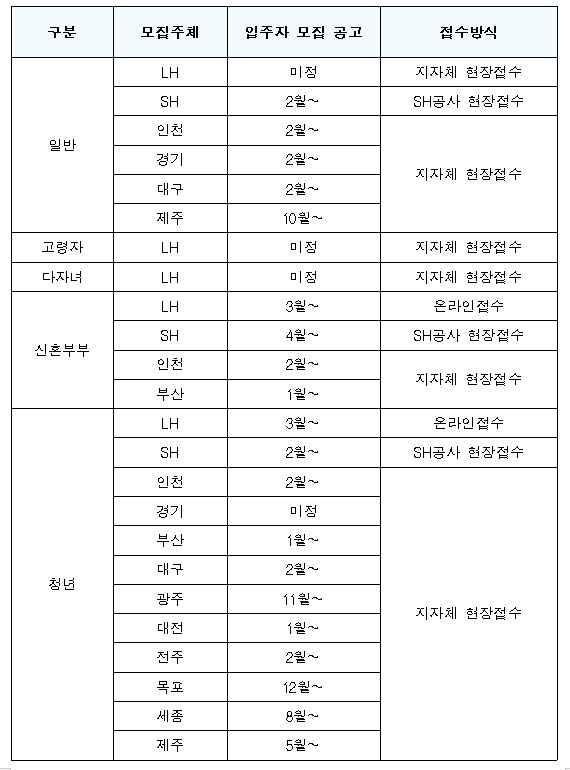 특히, 청년·신혼부부 유형은 입주자 모집에 대한 예측가능성을 높이고, 대학교 등 개강 전 입주가 가능하도록 3·6·9·12월에 통합 입주자 모집을 추진한다.